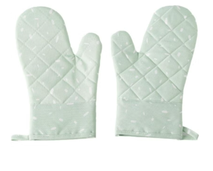 Thick insulated gloves designed to protect hands while handling hot pots, pans, and baking trays.